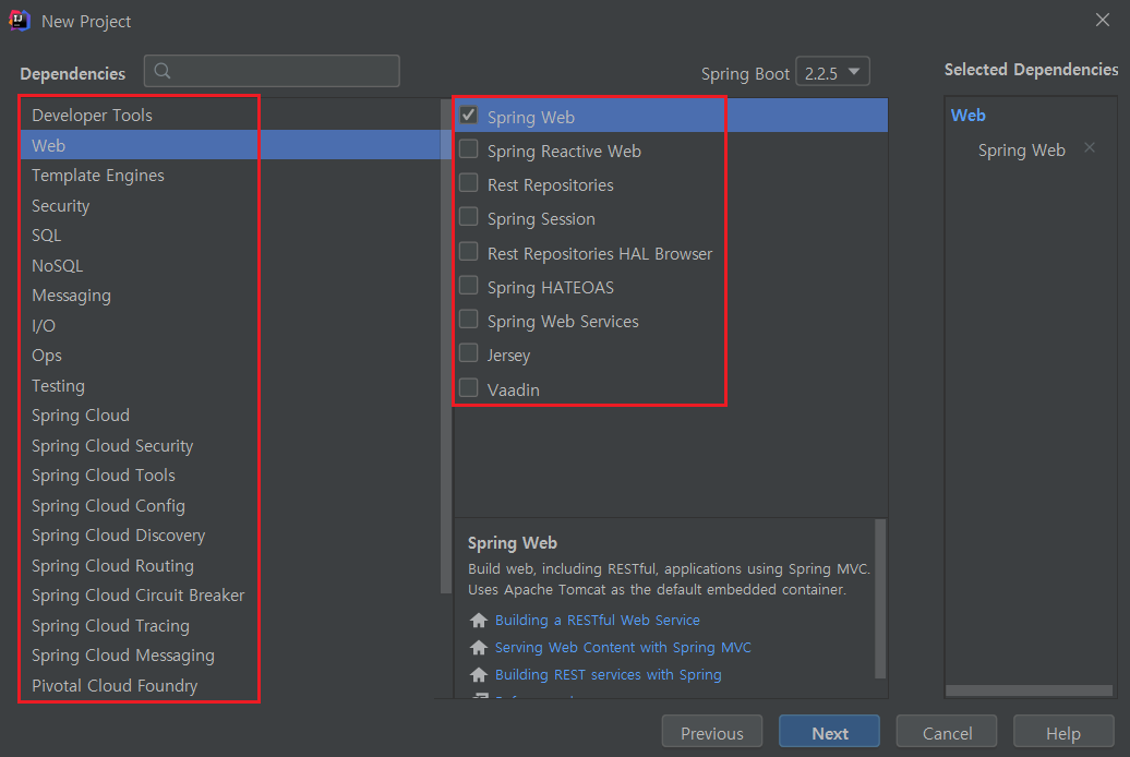 4. Spring Boot 프로젝트에 추가할 기능들 선택 - Next