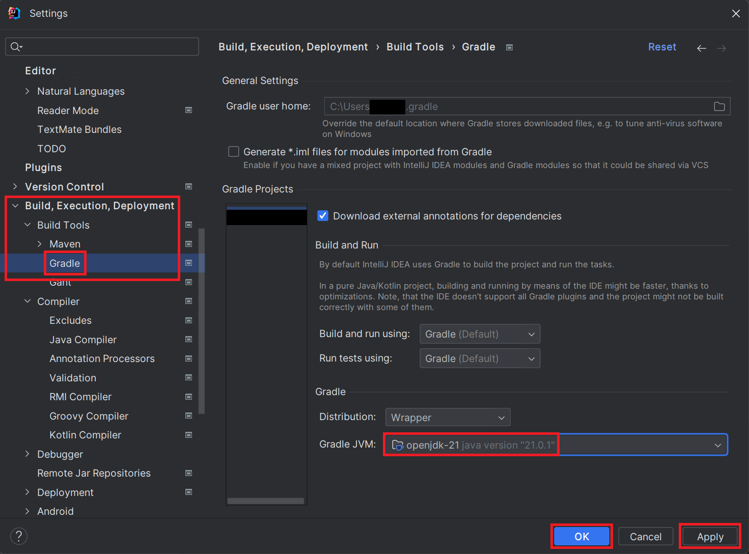 [Build, Execution, Deployment] - [Build Tools] - [Gradle] 화면 아래 [Gradle JVM]의 버전을 소스 JVM 버전과 동일하게 맞춰줌. -> [Apply] - [OK] 클릭하여 적용.