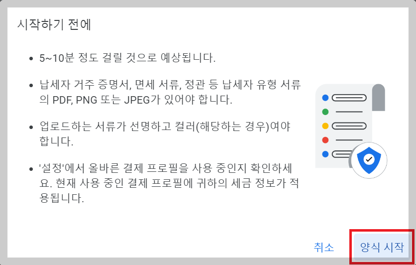 세금 면제를 '예'로 입력 후 거주자 증명서를 제출하는 방법