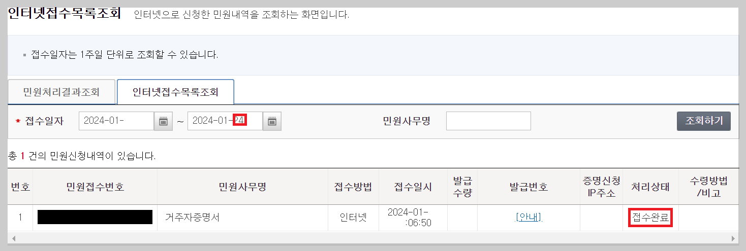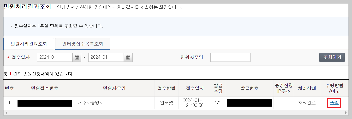 접수완료된 상태에서 하루쯤 지나니 출력 가능한 상태가 되었습니다.