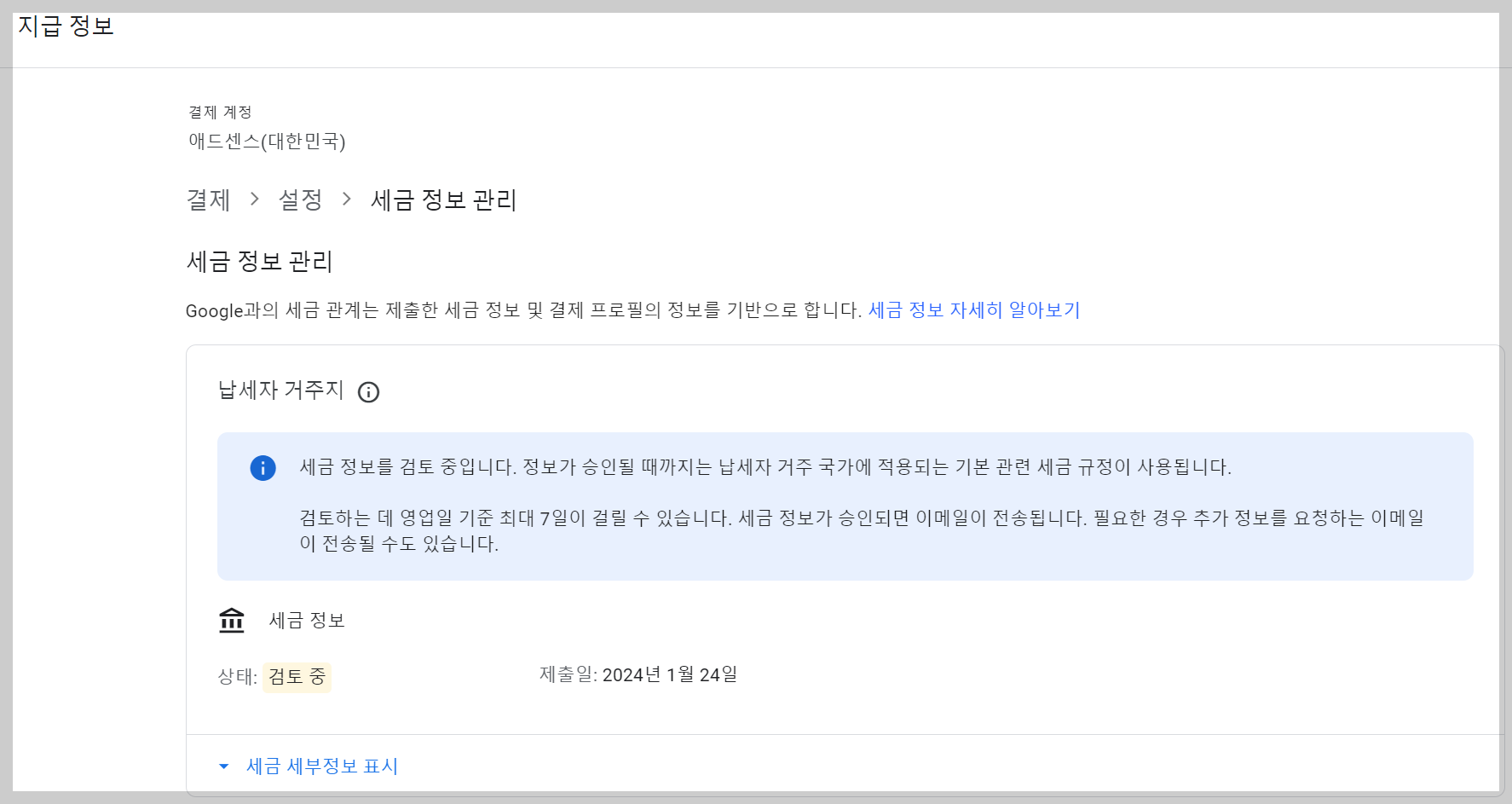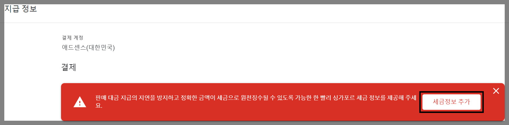 [구글 애드센스] 판매 대금 지급의 지연을 방지하고 정확한 금액이 세금으로 원천징수될 수 있도록 가능한 한 빨리 싱가포르 세금 정보를 제공해 주세요.