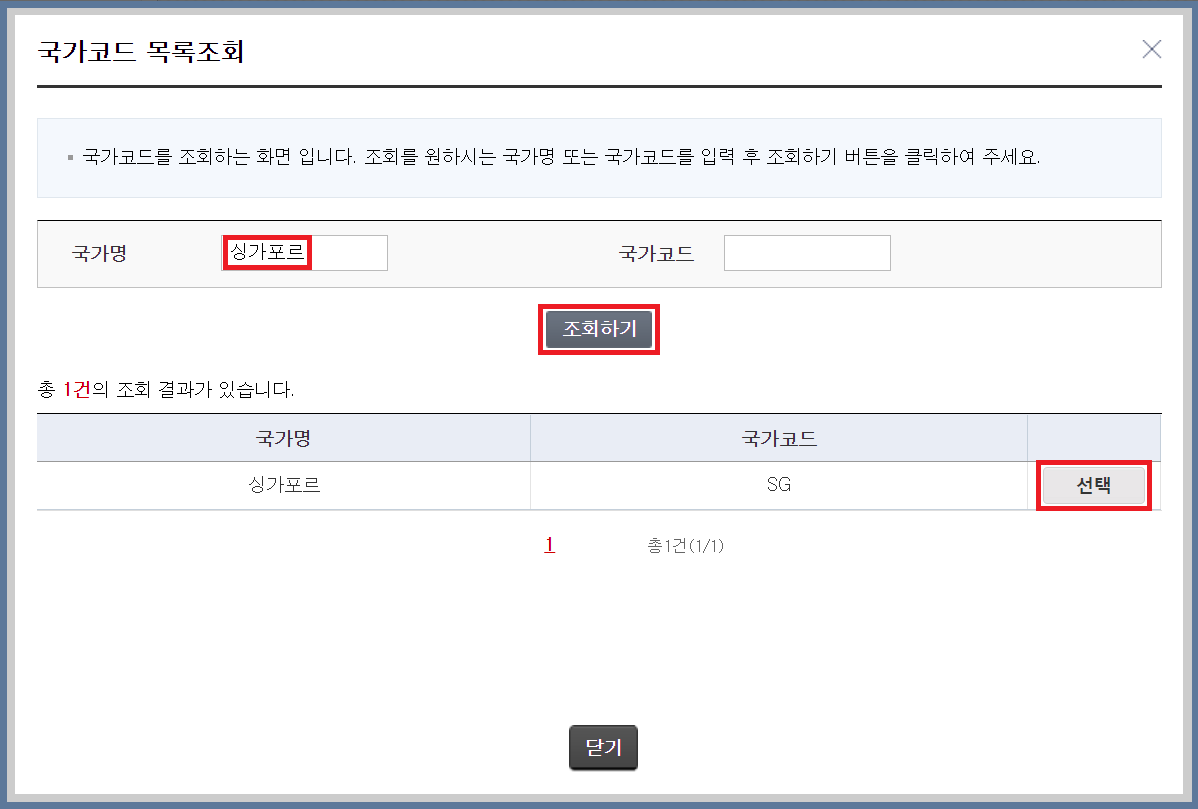 발급대상국가는 [코드검색]에서 아래와 같이 검색하여 선택해주시면 됩니다.