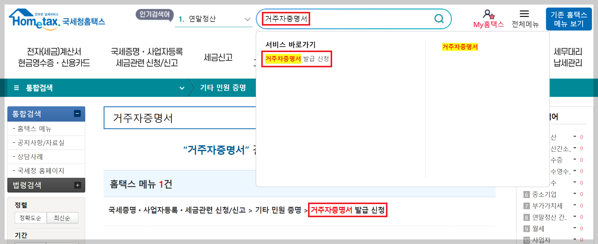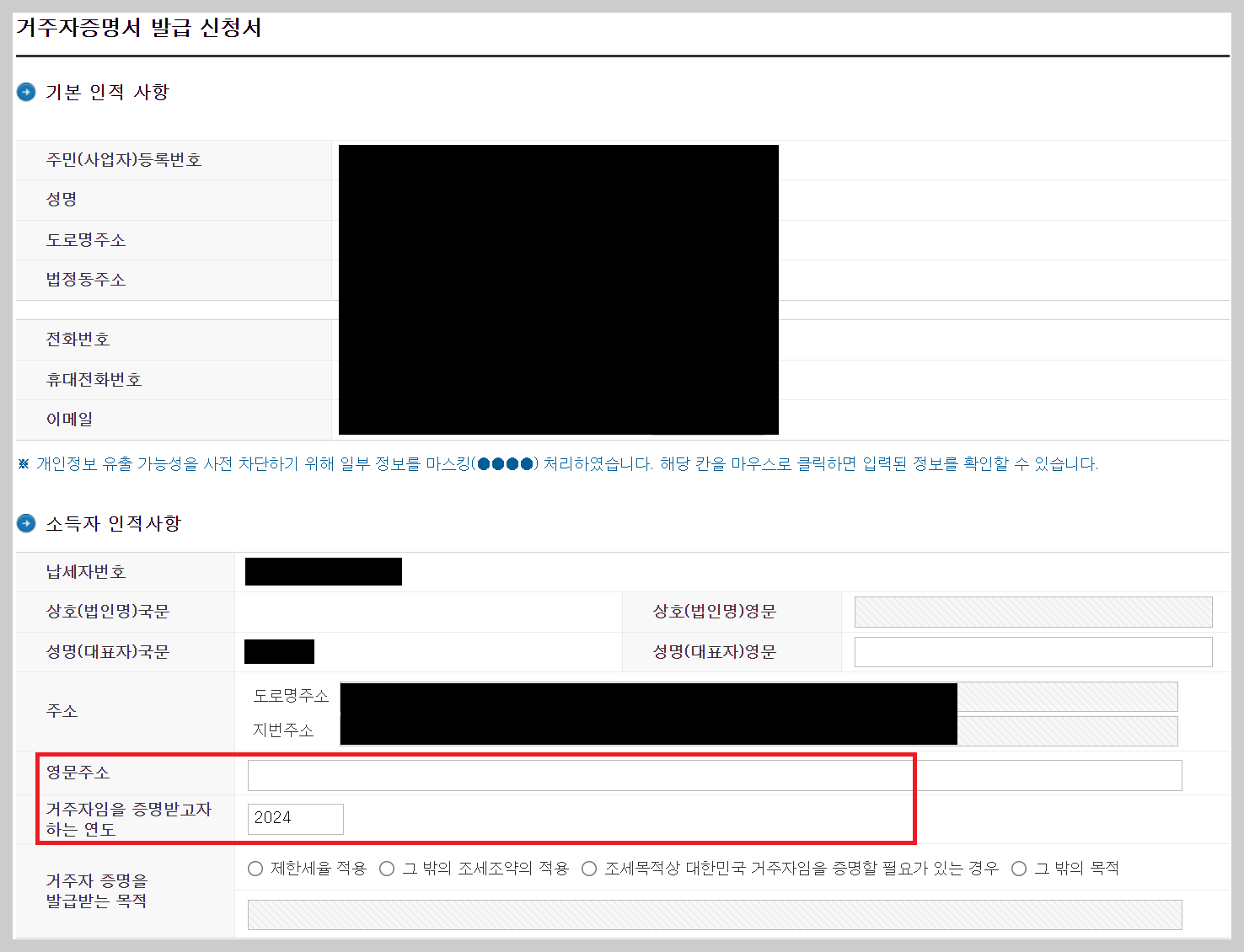 그리고 거주자임을 증명받고자하는 연도는 현재 연도로 입력하였습니다.