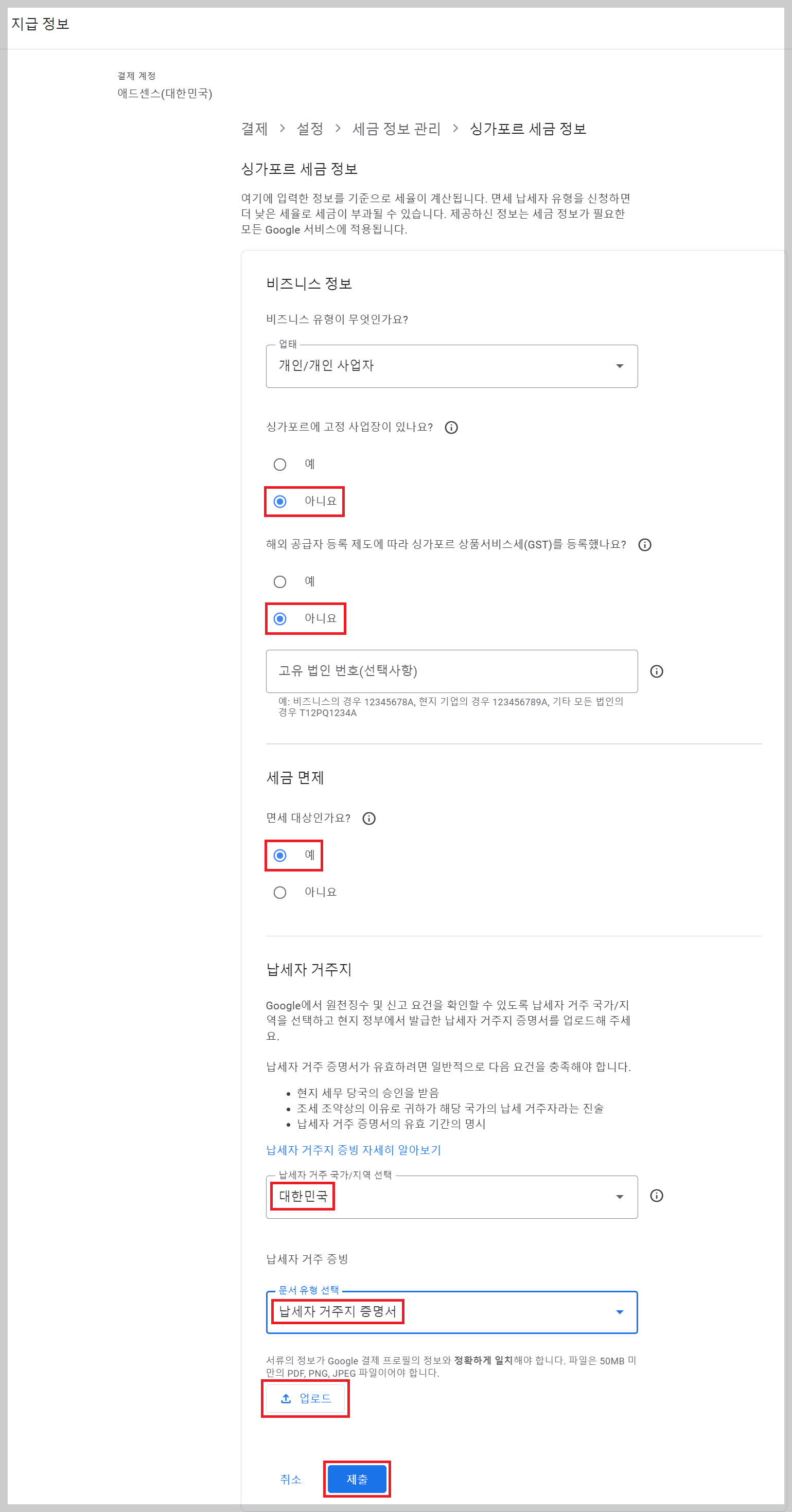 한국과 싱가포르는 이중과세방지협약을 맺고 있는 국가로 한국과 싱가포르 두 곳에 중복으로 세금을 납부하지 않기 위해서는(싱가포르에 세금납부 0%로 해야한다면) 면제 대상 체크 후 홈텍스에서 거주자 증명서를 발급하여 구글 애드센스에 제출하면 된다고 합니다.