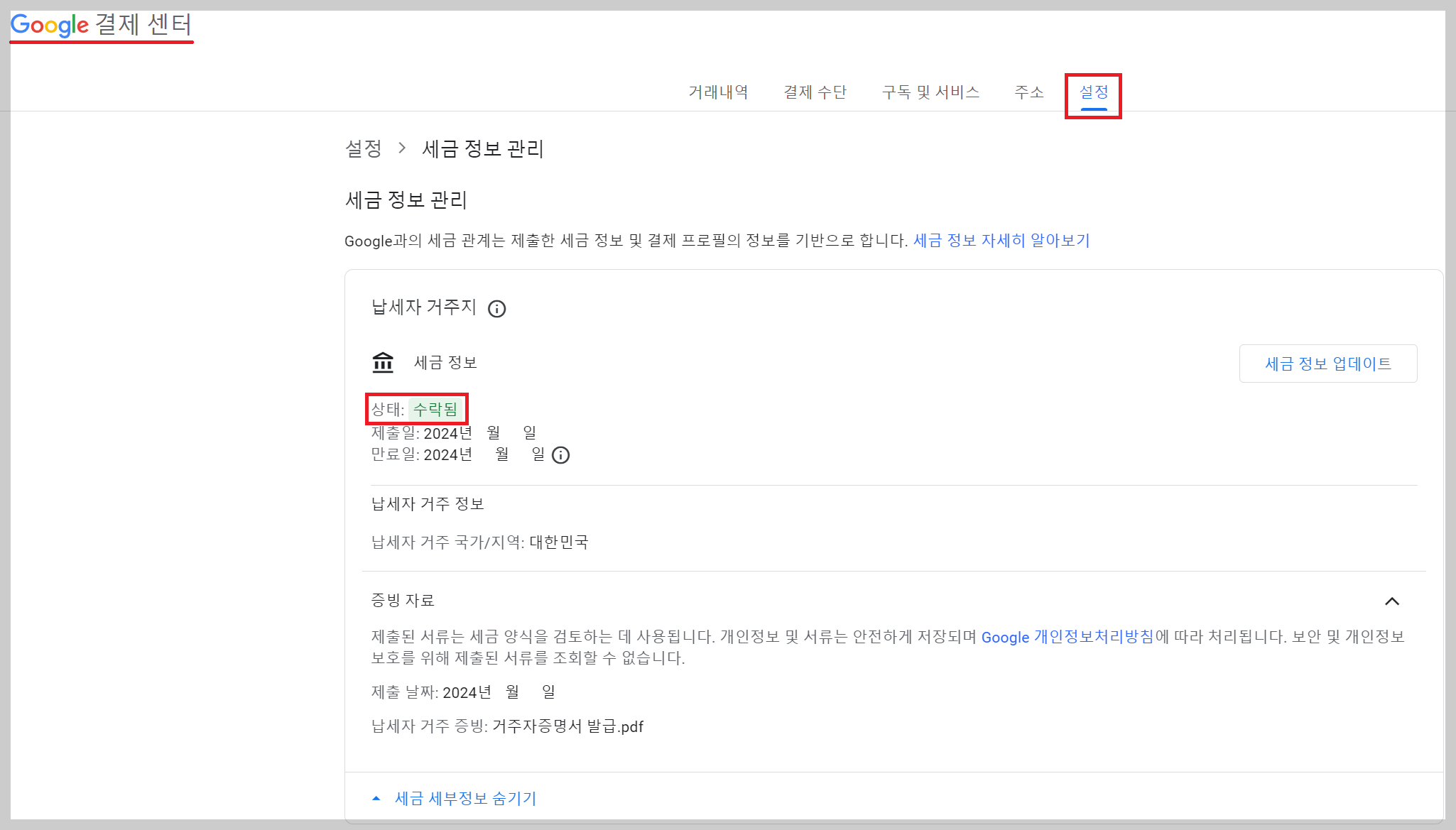 추후 구글 결제센터에서 싱가포르 세금 정보가 수락된 것을 확인할 수 있습니다.