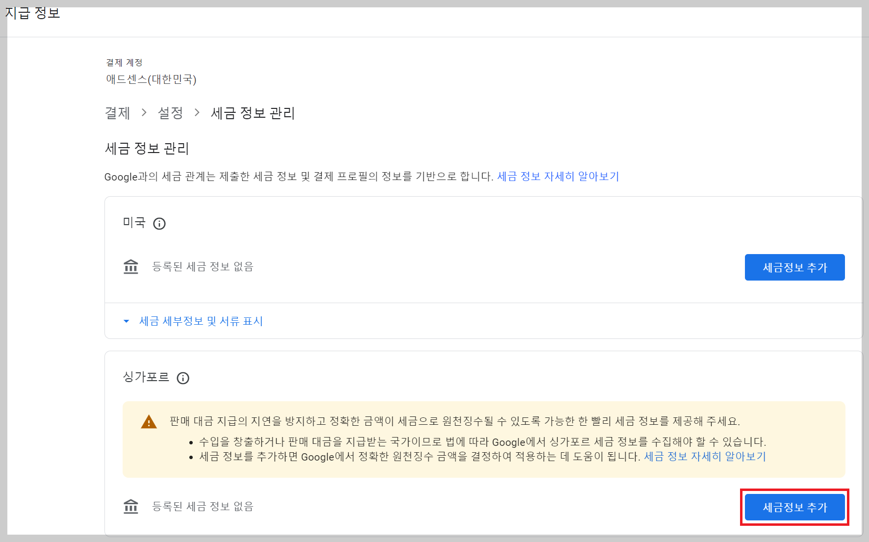 [구글 애드센스] 판매 대금 지급의 지연을 방지하고 정확한 금액이 세금으로 원천징수될 수 있도록 가능한 한 빨리 싱가포르 세금 정보를 제공해 주세요.