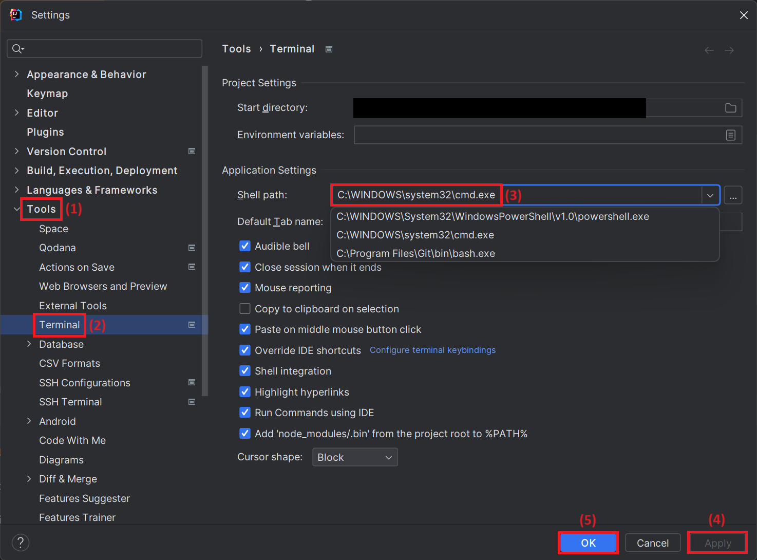 [Tools] - [Terminal] - [Application Settings] - [Shell path]에서 원하는 명령 프롬프트를 선택합니다.