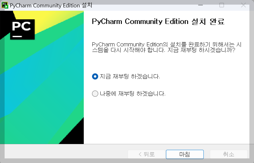 4. Pycharm을 설치하면 재부팅을 해주어야 합니다.