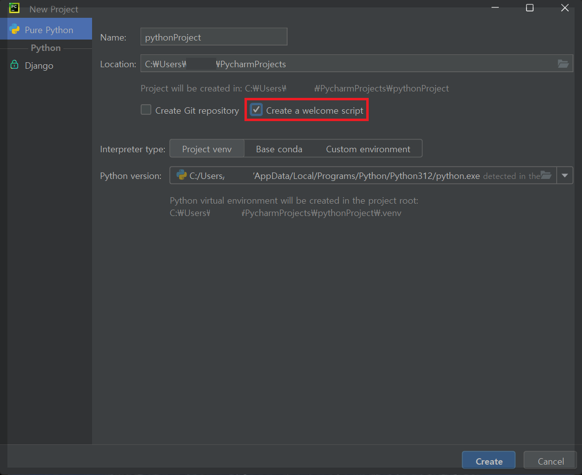 이것을 체크해주어야 생성되는 프로젝트에 기본 main.py 파일이 함께 생성됩니다.