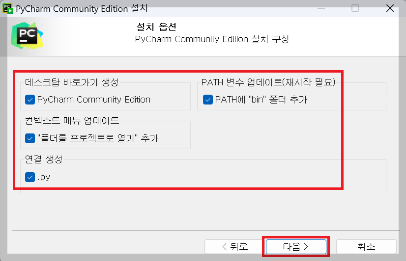 3. 아래 부분을 모두 체크해준 뒤 [다음] 버튼을 클릭해줍니다.