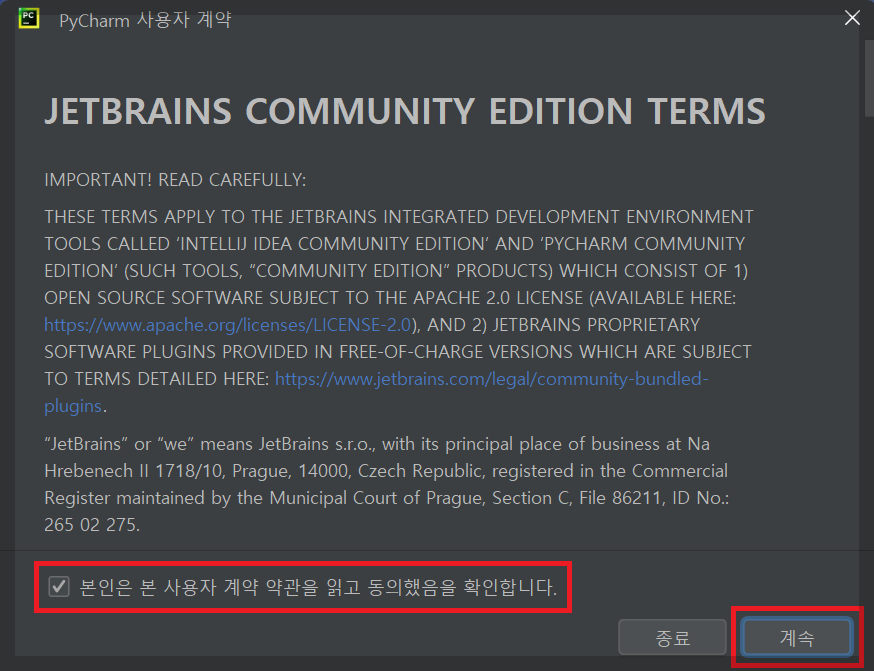약관 체크 후 [계속]을 클릭합니다.