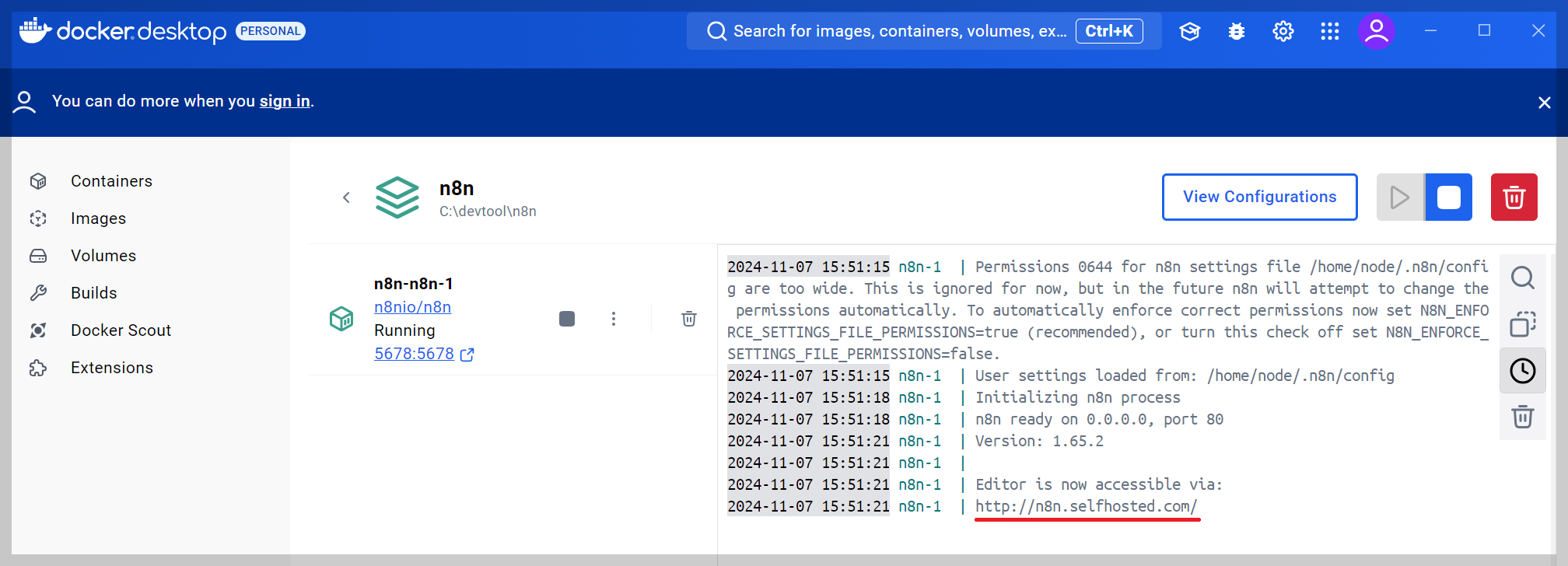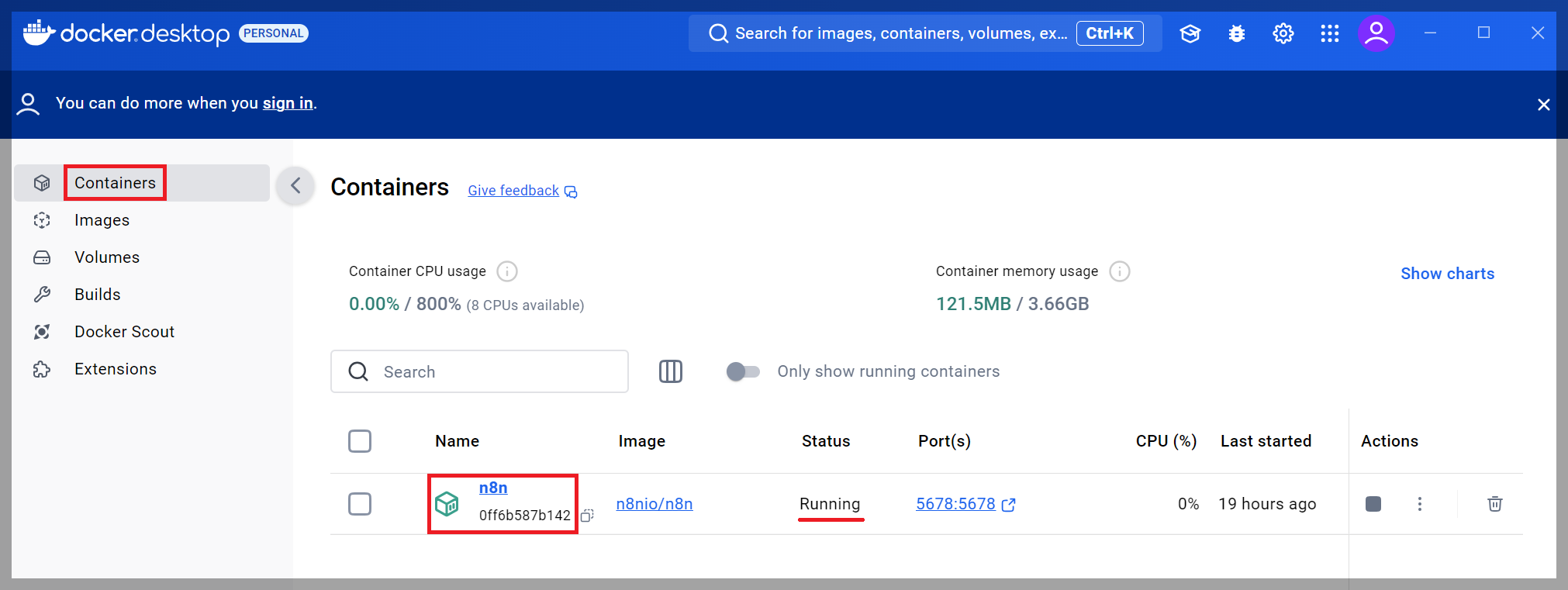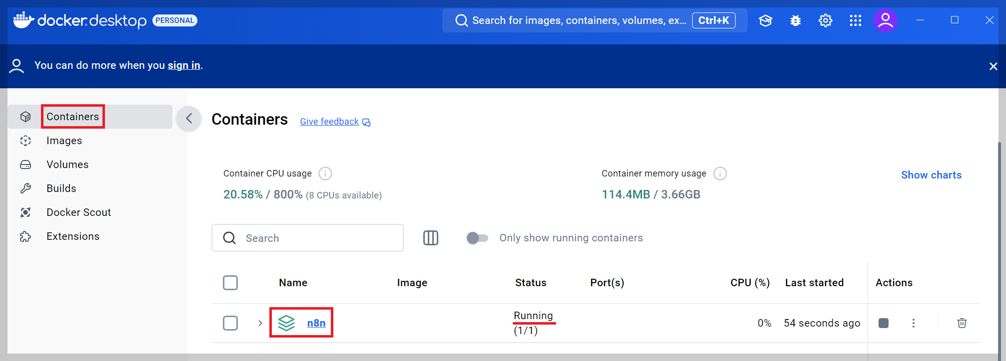 Docker Desktop에서 [Containers]를 보시면 n8n 이미지가 실행된 n8n 컨테이너가 잘 실행된 것을 확인할 수 있습니다.