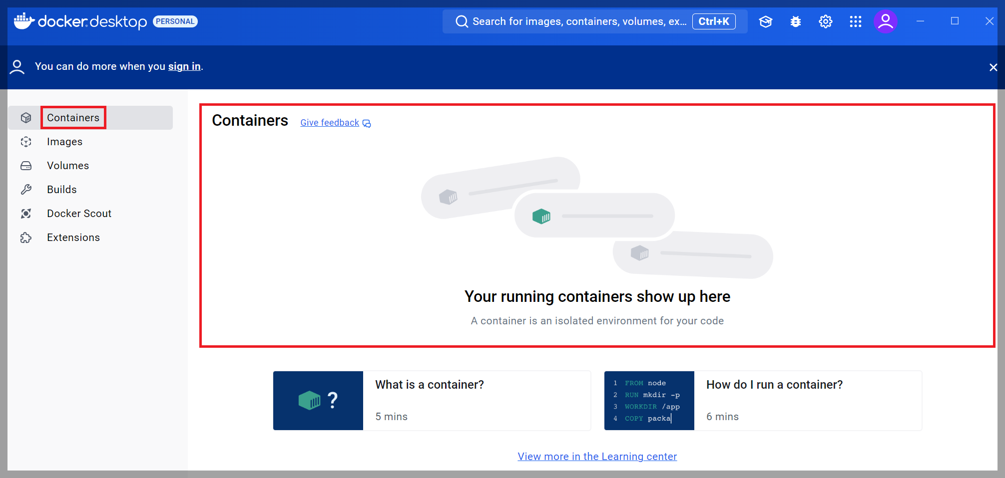 컨테이너가 종료되면 [Containers]에서 해당 컨테이너가 사라집니다.