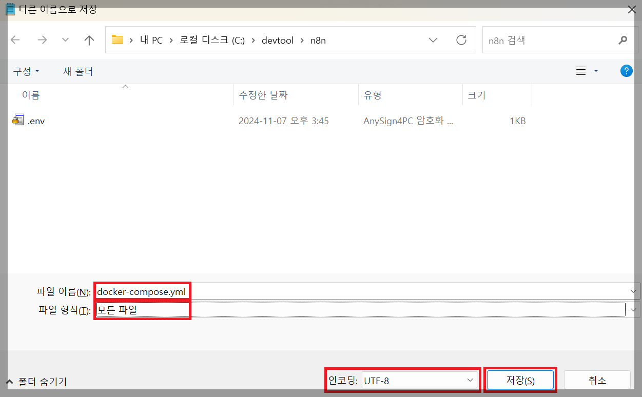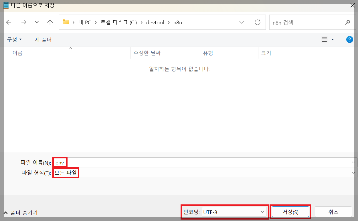 저는 C:\devtool 위치 아래에 n8n이라는 폴더를 생성해주었습니다.