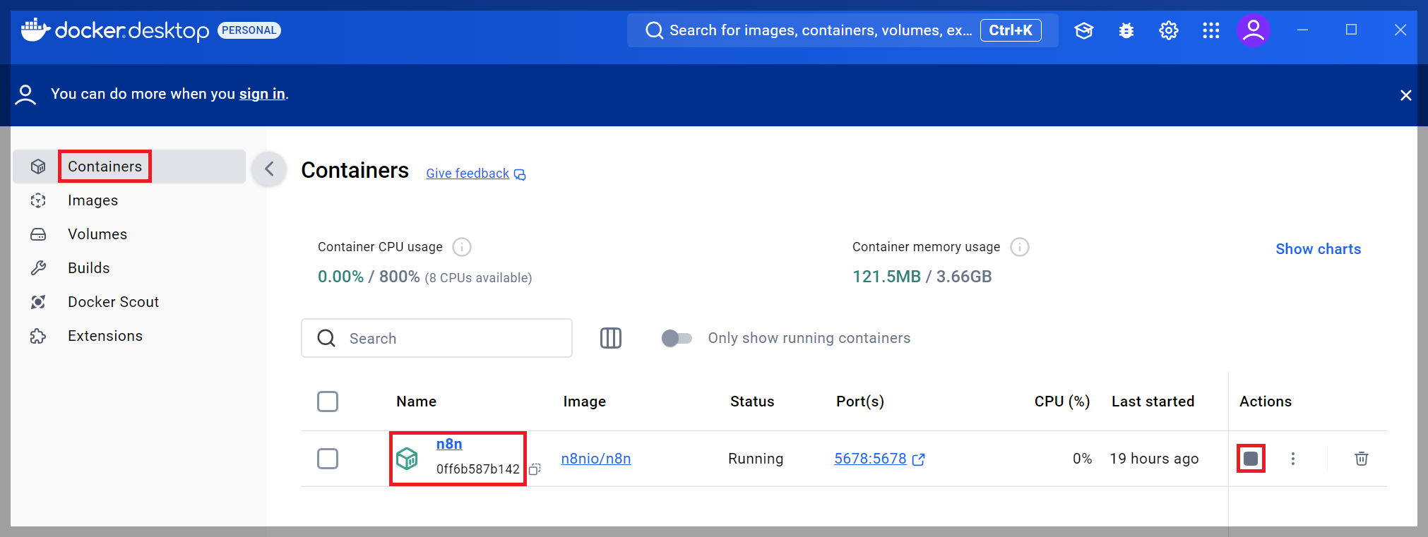 Docker Desktop에서 [Containers]에 있는 n8n 컨테이너를 [Actions]의 네모 아이콘을 클릭하여 종료시켜줍니다.