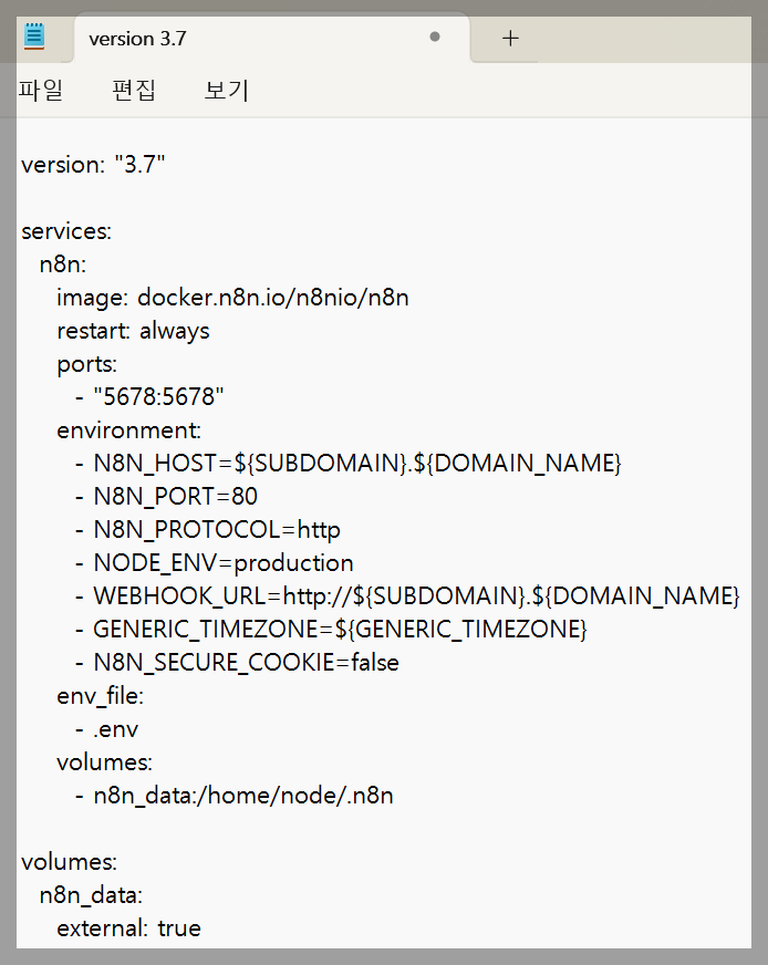 docker-compose.yml을 이용하여 설정정보를 정의하며 n8n을 실행시킬 수 있습니다.