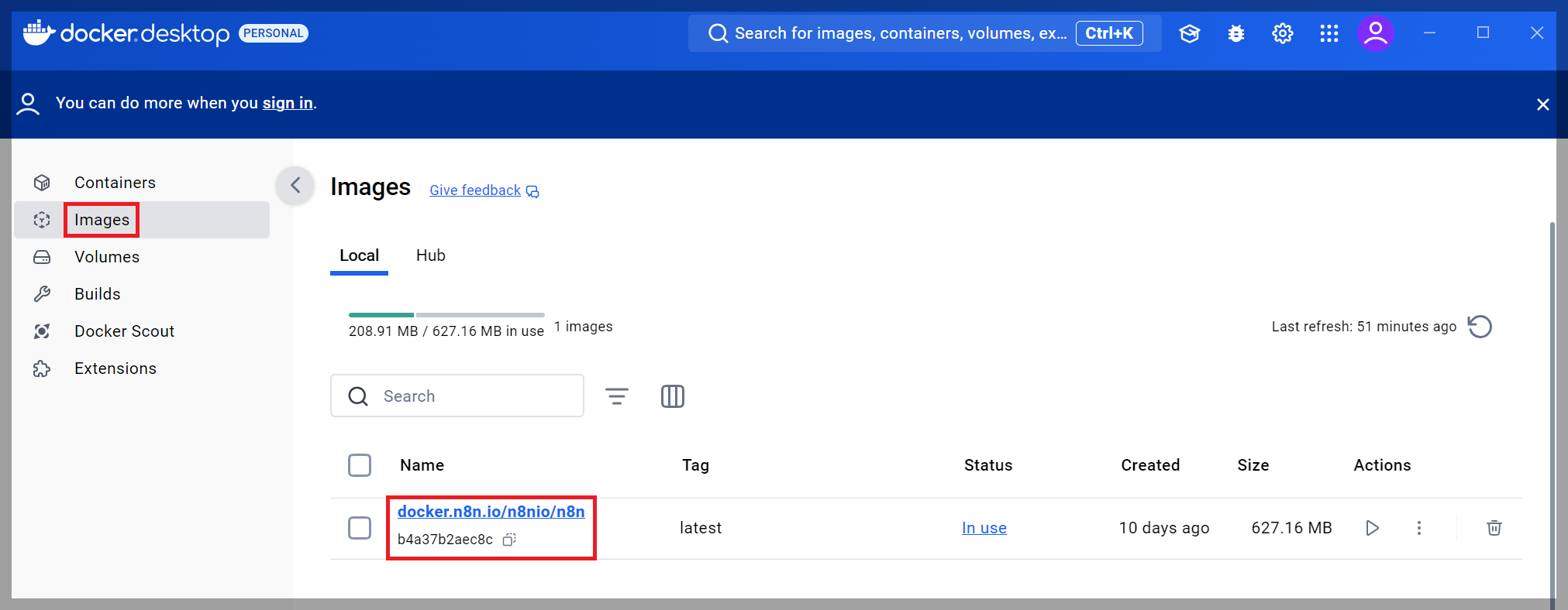 Docker Desktop에서 [Images]를 보시면 n8n 이미지(docker.n8n.io/n8nio/n8n)가 잘 Pull된 것을 확인할 수 있습니다.