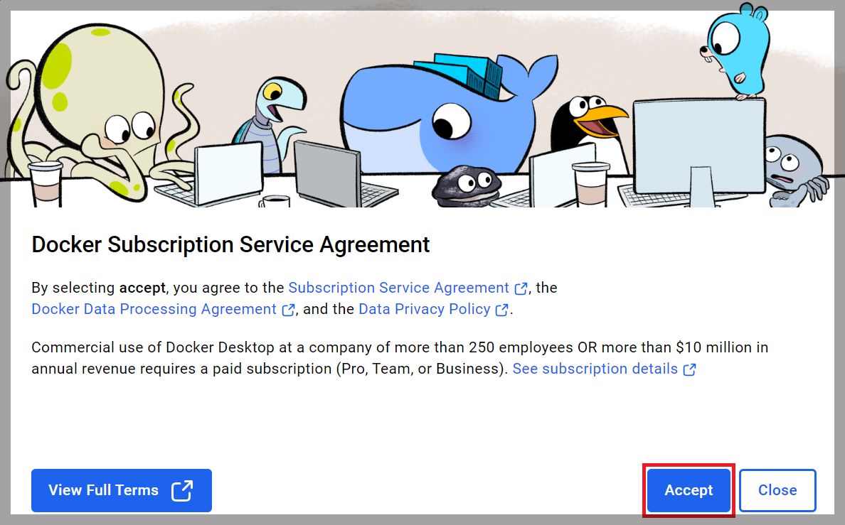 Docker 약관에 대한 내용입니다. [Accept]를 클릭해줍니다.