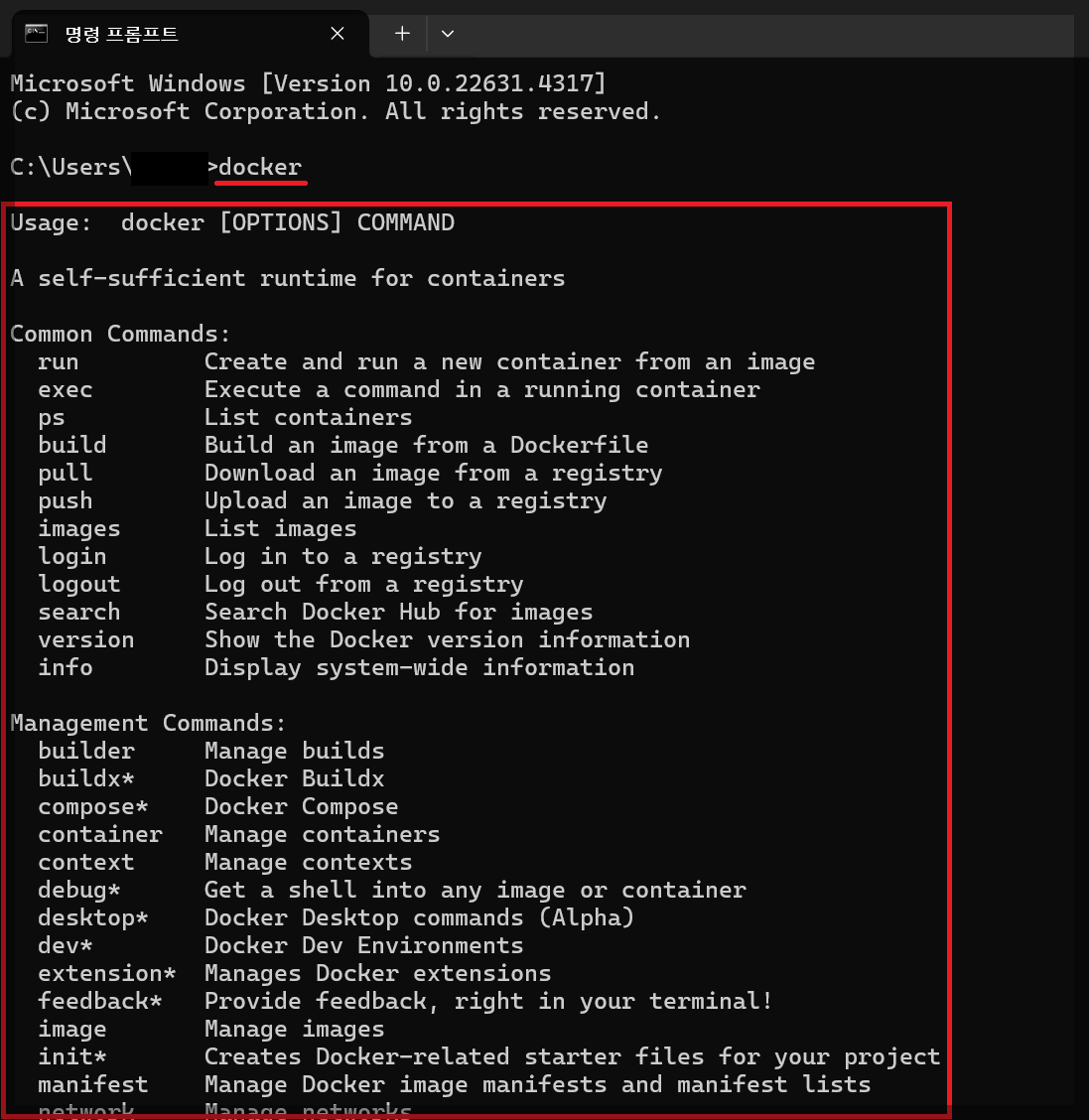 명령 프롬프트 창을 열어서 docker를 입력해줍니다.