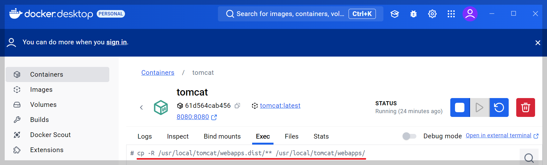 [Containers] - [tomcat 이미지] - [Exec]에 복사 명령어를 실행해줍니다.