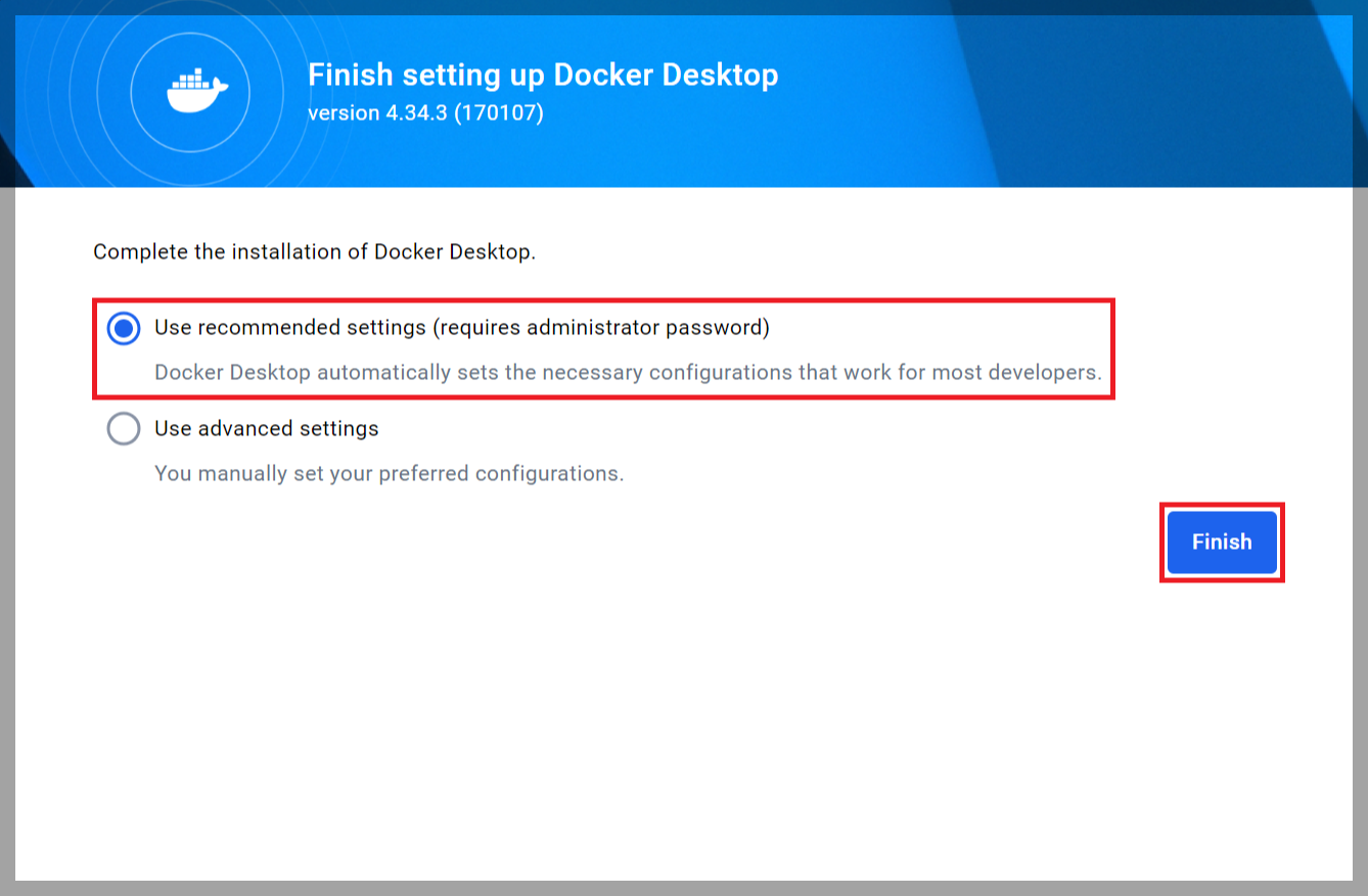 자동 셋팅된 설치를 하기 위해 [Use recommended settings]를 선택 후 [Finish] 클릭해줍니다.