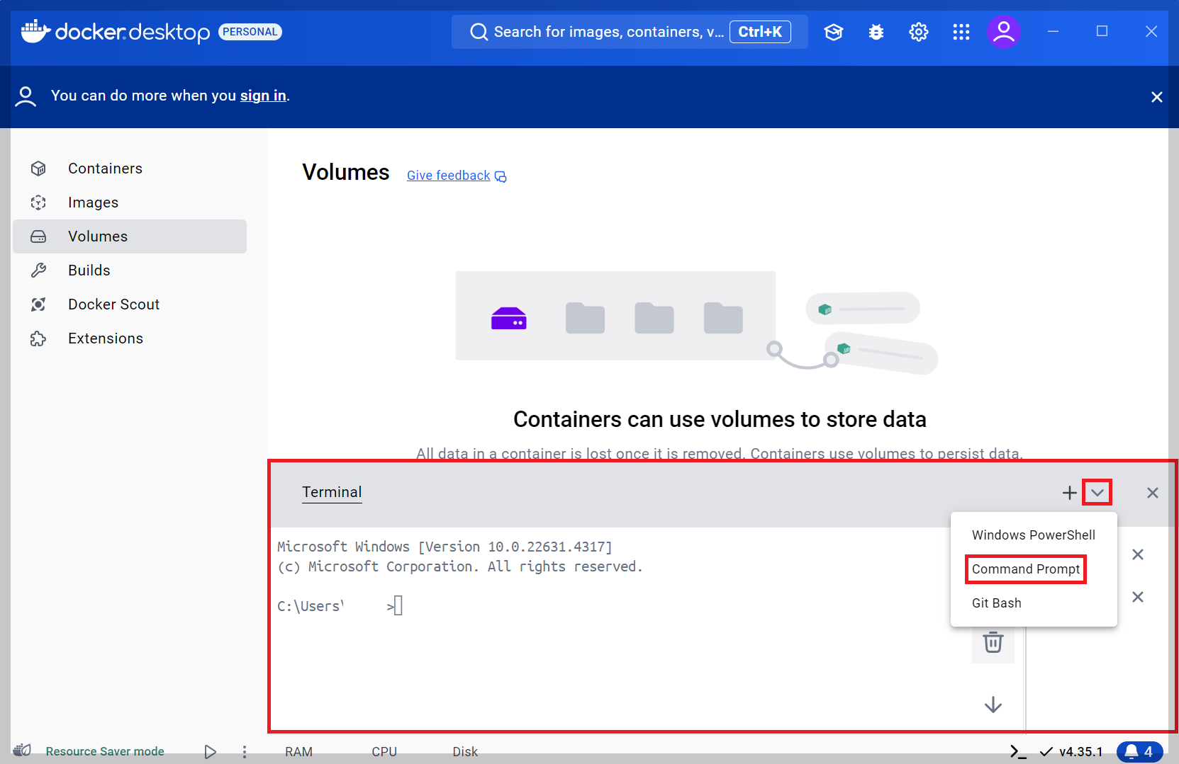 Docker Desktop에서 Terminal 기능을 제공해주는데 꼭 이걸 쓰지 않더라도 cmd를 이용해 명령 프롬프트창을 사용하셔도 됩니다. 여기서는 Docker Desktop에서 제공하는 기능이니까 한번 써보겠습니다.
