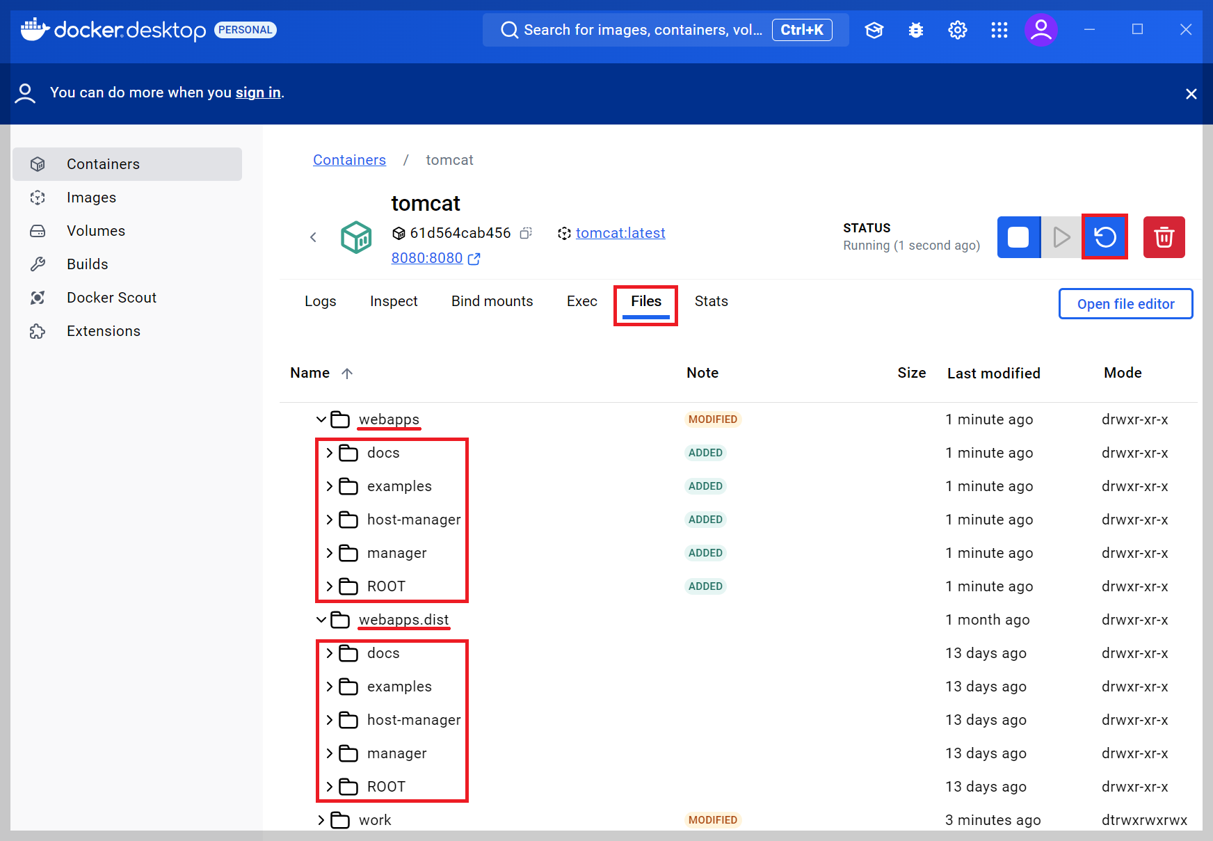 [Containers] - [tomcat 이미지] - [Files]를 보시면 wepapps.dist/의 리소스가 webapps/로 잘 복사되었습니다.