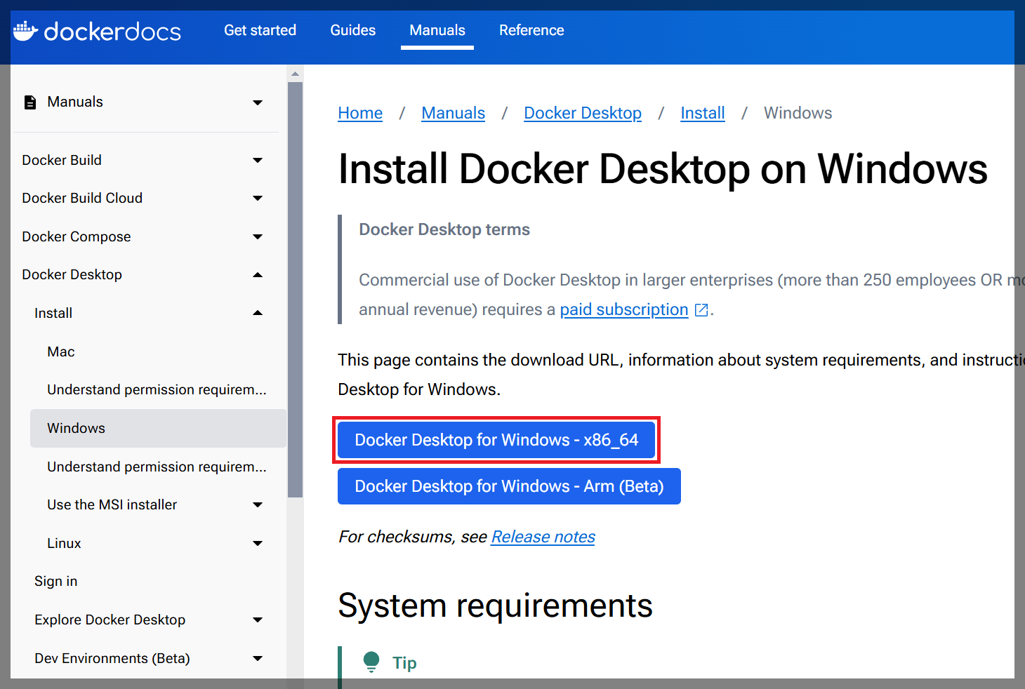 Beta 버전이 있긴하지만 안정성 있게 [Docker Desktop for Windows - x86_64]를 다운로드 받겠습니다.