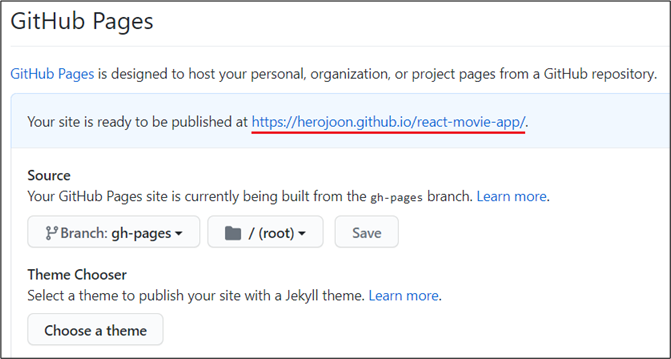 npm run deploy명령어 수행 후 Github Repository에 가보면 gh-pages라는 branch가 생성되어 있을 겁니다.